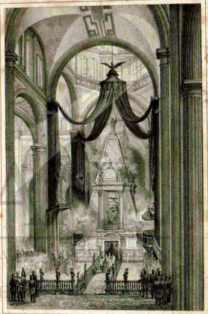 "Así es que al entrar de frente en aquel magnífico templo, los concurrentes quedaban asombrados al aspecto imponente y magestuoso que se presentaba á su vista. El fondo de la iglesia estaba vestido de negro desde las bóvedas hasta el pavimento: lo estaba igualmente en toda su altura las cuatro columnas del centro del crucero, resaltando más en aquel inmenso fondo oscuro un haz de tres banderas trigarantes, atada y colocada en cada una de las columnas á cierta elevación . Los colores de todas estas banderas estaban en armonía con un grandioso pabellón tricolor suspendido bajo la media naranja, cuyo círculo tenía veinte y una varas de circunferencia y del cual salían abriéndose cuatro fajas también tricolores de más de cuatro varas de ancho á colocarse sobre los capiteles de las columnas enlutadas en que se hallaban las banderas.